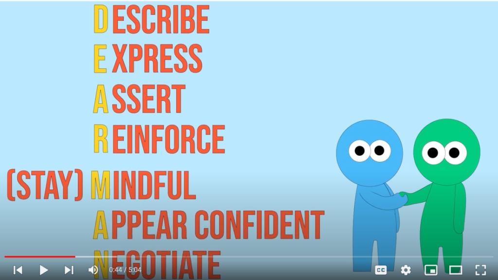 Le DEAR MAN est une compétence interpersonnelle utilisée pour demander quelque chose d’une manière respectueuse et efficace qui construit et maintient une relation – que vous obteniez ou non ce que vous demandez.