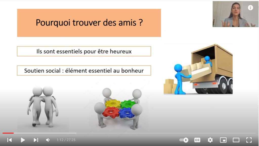 Savoir comment s’entourer permet de diminuer l’isolement et la sentiment de solitude. La vidéo suivante énonce les principes de base pour se trouver des amis et entretenir ces amitiés de façon efficace.